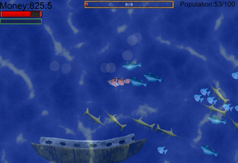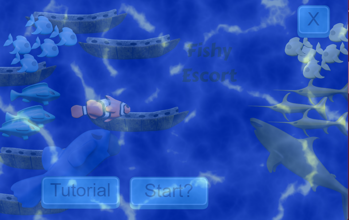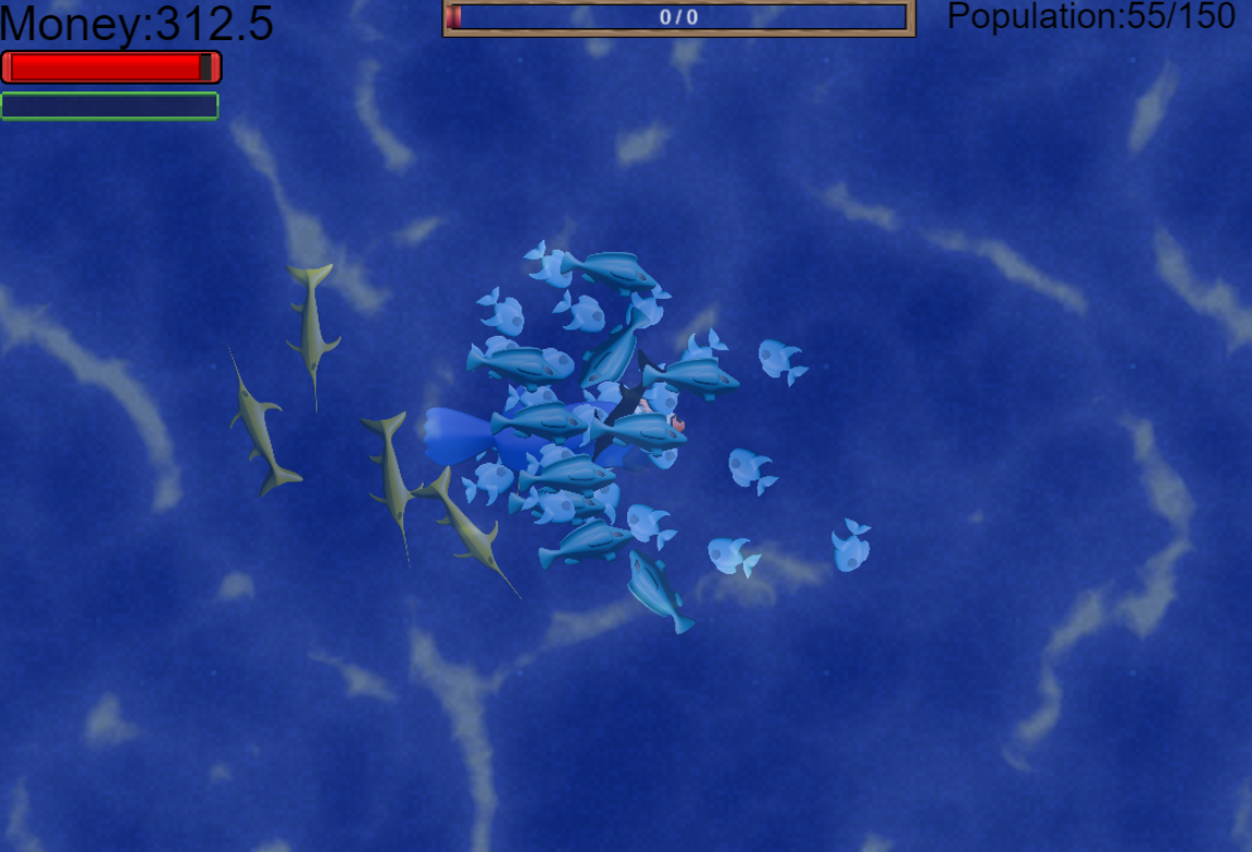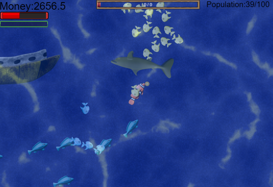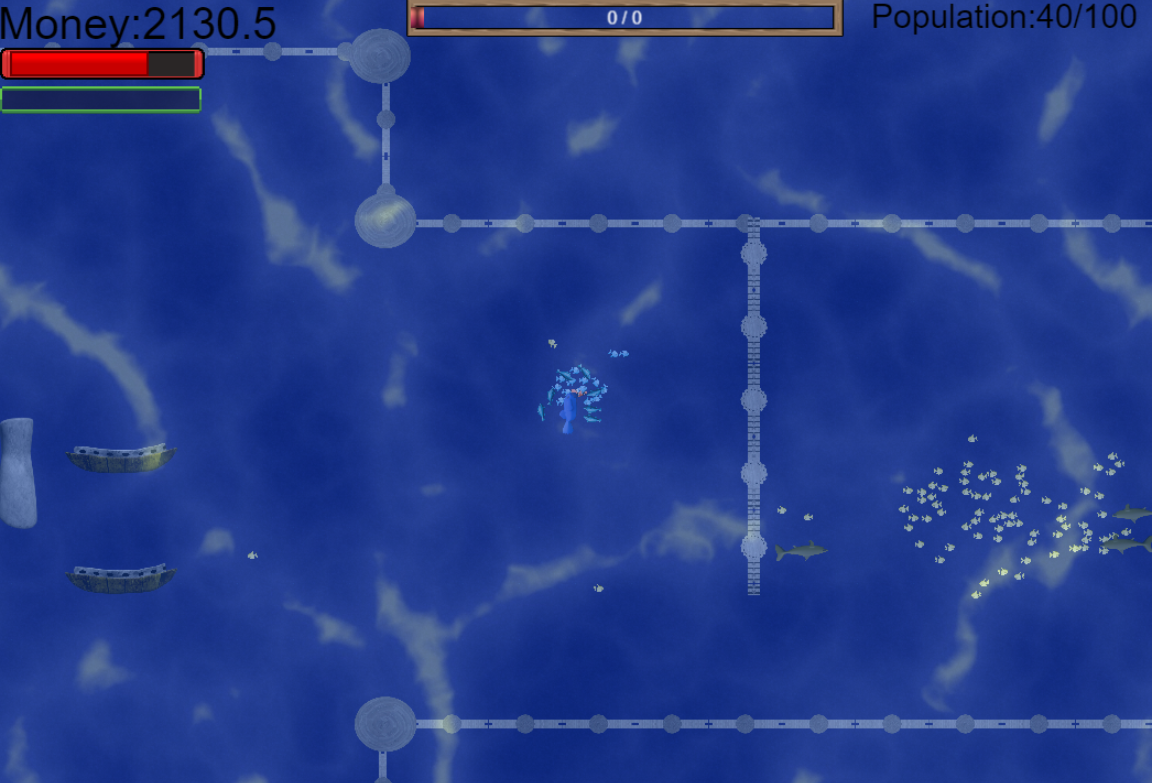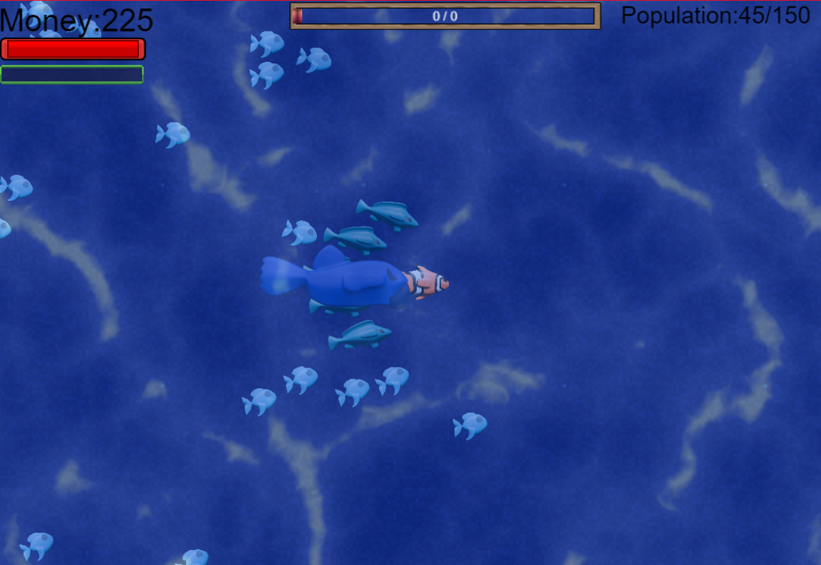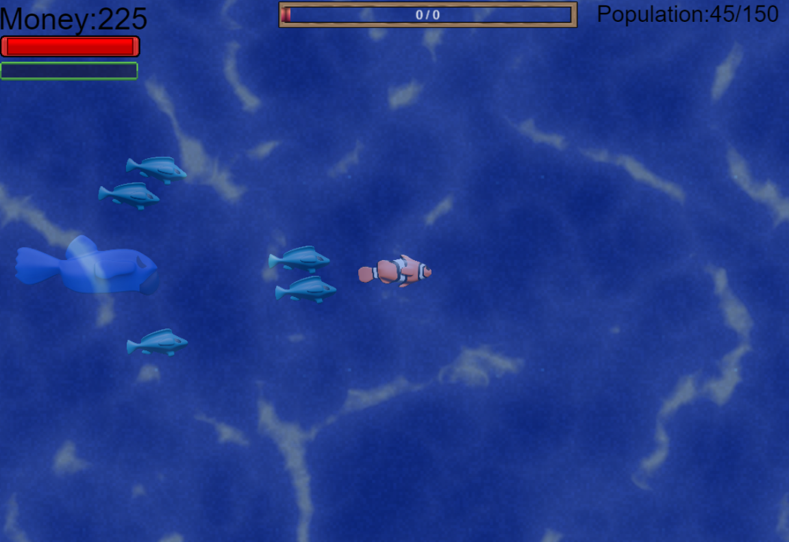 You are a young fish by the name of Rede. You are a rare breed of fish blessed with supernatural abilities and unmatched leadership. In a desperate attempt to defend themselves from the orange fish, the blue fish chose you to lead them. To lead them against this evil ruler of the orange fish. Your last hope against your enemies is your ships. Which have cannons of unmatched power. But you must get them to the enemy kingdom safely.